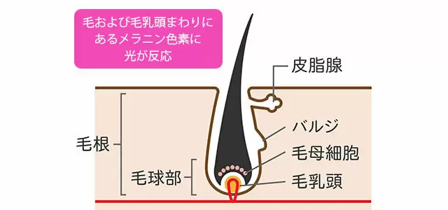 まずはSHR脱毛の特徴を簡単に解説します。 脱毛サロンで一般的なSSC脱毛やIPL脱毛は、毛乳頭(毛細胞)とつながっている成長期の毛・毛根(黒いメラニン色素)にアプローチする脱毛法です。 一方、SHR脱毛は毛根ではなく、バルジ領域(毛が生えるように指令を出す部位)と毛包自体にダメージを与えます。